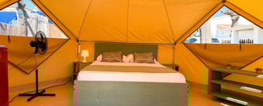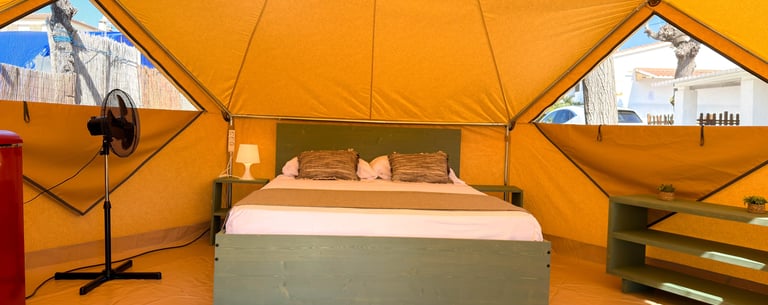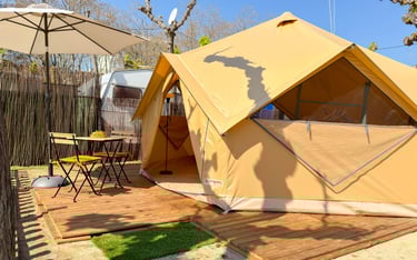 Acogedora tienda de glamping con dos habitaciones, baño privado y aire acondicionado. Dispone de cocina totalmente equipada y una cómoda zona de comedor. Terraza amplia con mesa, banco y barbacoa portátil.