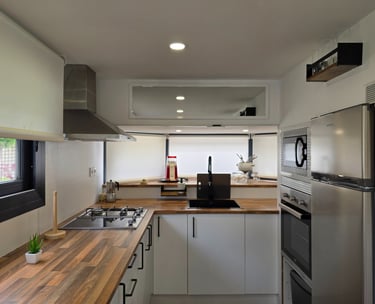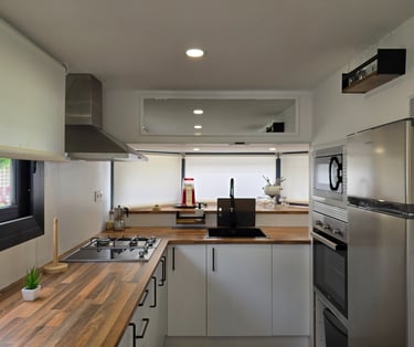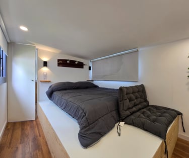 Bungalow estilo Cabyn, acogedor y funcional, ideal para disfrutar de unos días de relax en plena naturaleza. Dispone de cama de matrimonio, cocina office equipada, baño con ducha moderna y un interior diseñado para ofrecer confort y sencillez. Un espacio pensado para parejas, familias o amigos que buscan comodidad en un entorno cálido y natural.