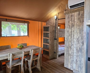Acogedora tienda de glamping con dos habitaciones, baño privado y aire acondicionado. Dispone de cocina totalmente equipada y una cómoda zona de comedor. Terraza amplia con mesa, banco y barbacoa portátil.