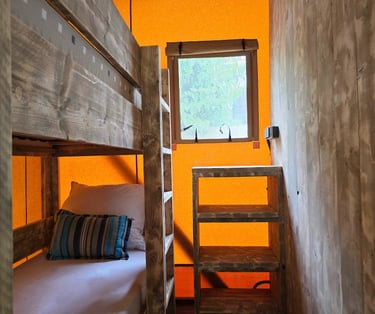 Bungalow estilo Cabyn, acogedor y funcional, ideal para disfrutar de unos días de relax en plena naturaleza. Dispone de cama de matrimonio, cocina office equipada, baño con ducha moderna y un interior diseñado para ofrecer confort y sencillez. Un espacio pensado para parejas, familias o amigos que buscan comodidad en un entorno cálido y natural.
