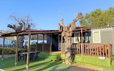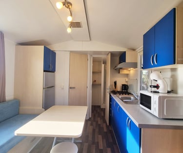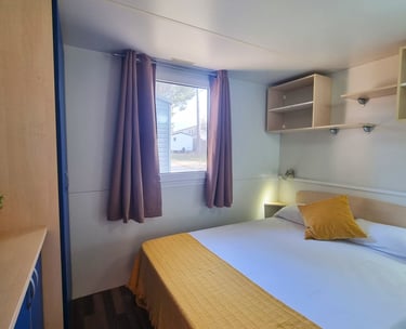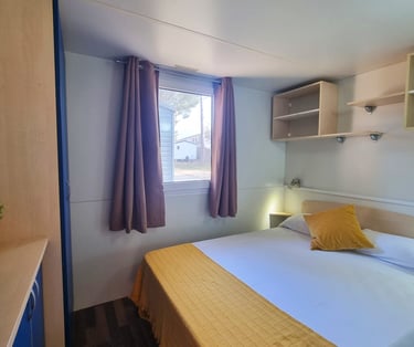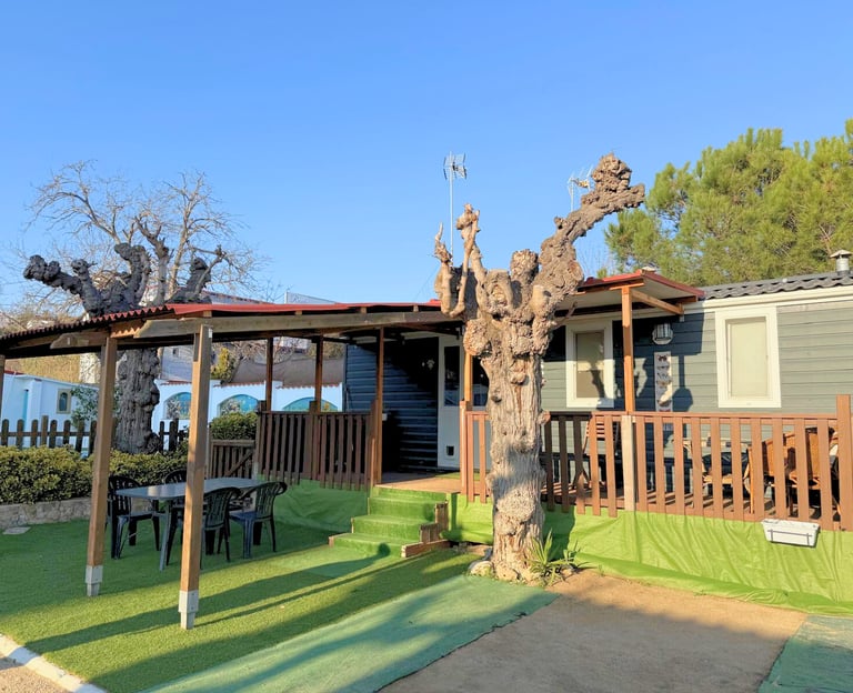 Bungalow estilo Cabyn, acogedor y funcional, ideal para disfrutar de unos días de relax en plena naturaleza. Dispone de cama de matrimonio, cocina office equipada, baño con ducha moderna y un interior diseñado para ofrecer confort y sencillez. Un espacio pensado para parejas, familias o amigos que buscan comodidad en un entorno cálido y natural.